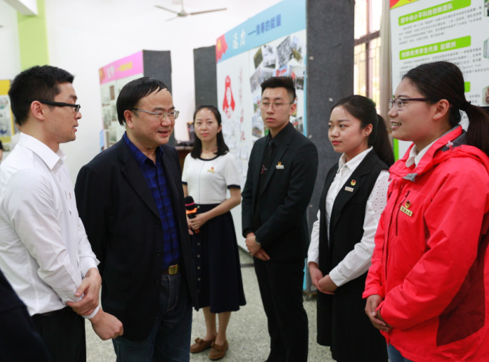 唐绍祥倾听了校优秀学生代表对所在团队的介绍。作为学校一支极具特色的理论宣讲队伍,电竞博彩
