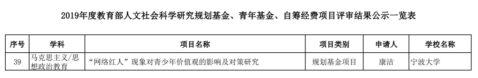 1月29日,教育部社科司对2019年度教育部人文社会科学研究一般项目评审结果进行公示。其中,规划基金、青年基金、自筹经费项目共3098项通过专家评审。电竞博彩 康洁老师的项目《“网络红人”现象对青少年价值观的影响及对策研究》获规划基金项目立项公示。