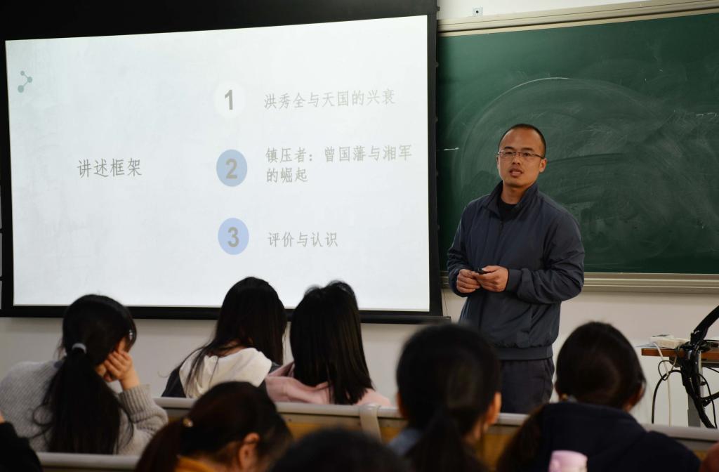 郑善庆博士主讲的课程为《中国近现代史纲要》的“太平天国运动”一节。郑博士以太平天国运动中的主要人物洪秀全生平事迹为切入口,佐以大量的历史史料和前沿研究成果阐释了太平天国兴起及由盛转衰的过程和原因。课堂上,郑博士通过提问、互动讨论的方式以及形象生动的案例,就太平天国运动中颁布的《天朝田亩制度》和《资政新篇》的意义、镇压者曾国藩和湘军是如何崛起及后世对太平天国运动的评价等方面进行了深入的剖析。郑善庆博士语言生动,讲解思路清晰,教学内容有理论深度,善于引发学生的思考。