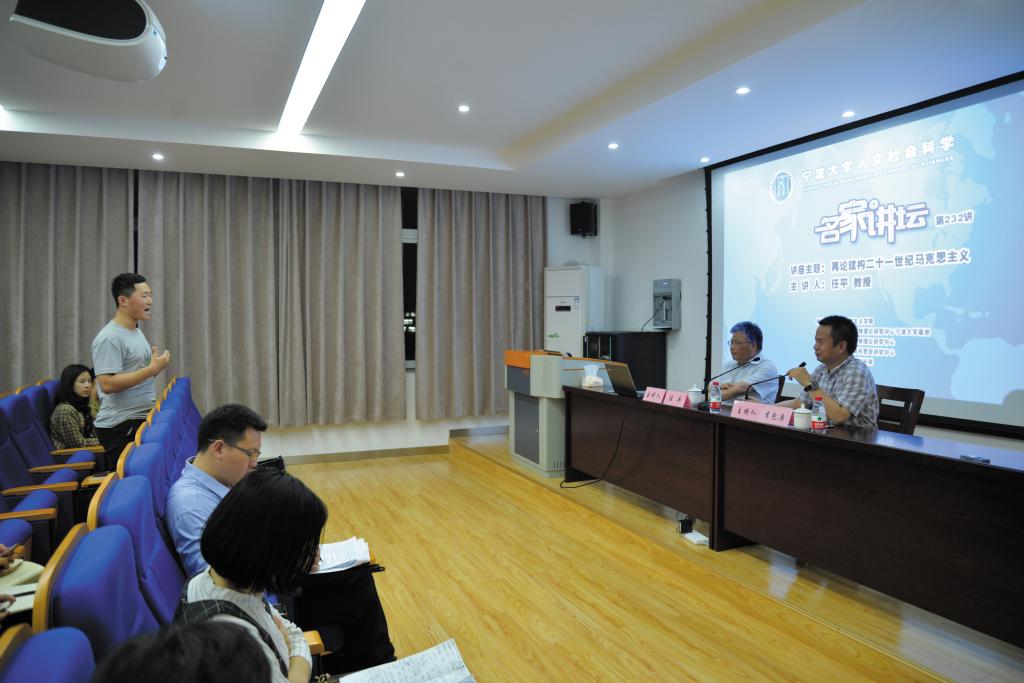 任平教授首先引用习总书记的“三个前所未有”强调了我国正处于社会发展的关键期,在全球经济政治发展的洪流中,中国要成为一个负责任的大国就必须从三个方面做出转变。一是要摆脱“学徒”状态,中华民族必须重建学术结构和精神结构,不能照搬西方的标准和模式;做研究必须从中国的实际出发,否则就是虚假学问。二是中国要为世界创造思想,要把中国方案转变为中国思想,用理论和思想去讲好中国故事。三是在消化吸收他人成果的同时,还要实现原创,不仅要研究中国特色社会主义,还要实现“后中国特色社会主义”,把“中国的特殊”转化为“世界的一般”,让世界人民了解、信任、支持中国。这个过程是立场的转变、问题的转变、经验的转变、话语的转变,也是学术理论的转变。他强调,要用学术讲政治,要实实在在地去解决中国实际问题,为马克思主义的发展贡献自己的力量。任教授深入浅出的讲解引起了在座师生的强烈共鸣,现场师生与任教授进行了热情的互动交流。