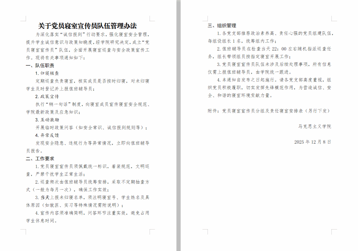 组织“党员文明寝室宣传队”深入各学生寝室,开展“诚信守规・安全护航”专项行动,以实际行动践行党员使命,推动寝室治理提质增效。